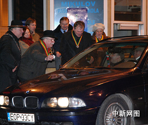 一組歡慶的民眾在捷奧邊境捷克一側(cè)米庫洛夫海關(guān)攔住過往車輛詼諧地用德語喊道:“請出示您的護(hù)照!” 然后向司機遞上一杯葡萄酒。