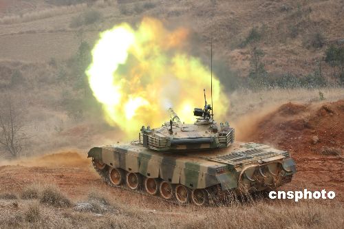 圖為訓(xùn)練中,中方坦克分隊對恐怖分子實施武力打擊。