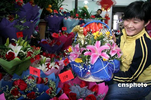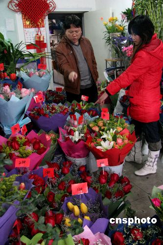 2月13日,顧客在挑選鮮花。為迎接“情人節(jié)”,山東威海各花店生意紅火,許多顧客為女友和母親訂購鮮花,鮮花市場銷售異常火爆,許多花店為此招臨時(shí)工幫忙。中新社發(fā) 海云飛 攝