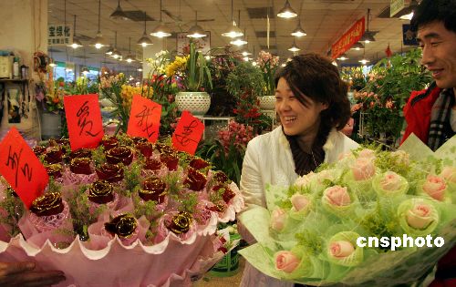 二月十三日,形形色色的口彩玫瑰亮相上海情人節花市。圖為逛花市的女性面對由五十七朵玫瑰組成的諧音“吾愛我妻”口彩玫瑰開心不已。中新社發 潘索菲 攝