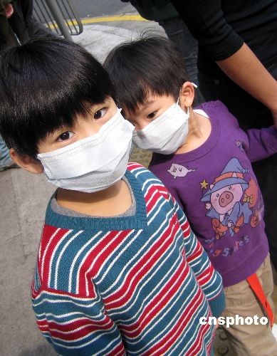 三月十四日,兩位戴口罩的香港小童在保姆的帶領(lǐng)下走過街頭。因多所學(xué)校學(xué)生患流感并有三名兒童因流感死亡,香港小學(xué)、幼兒園等自昨日起全部停課兩星期,以防止疫情擴(kuò)大。中新社發(fā) 王麗南 攝