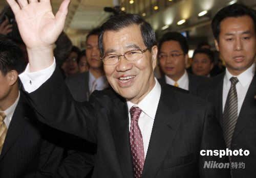 4月11日上午,兩岸共同市場基金會董事長蕭萬長,搭乘華航CI605航班離開桃園機場,前往海南島參加博鰲亞洲論壇2008年會。中新社發 杜洋 攝