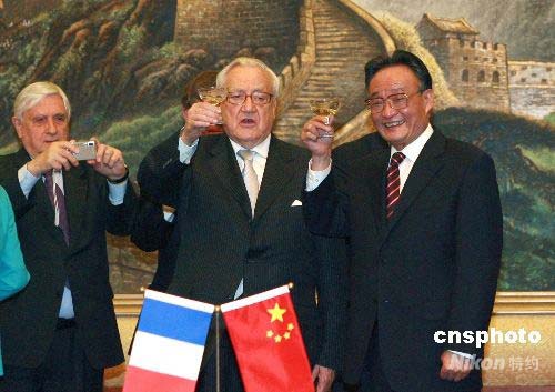 蓬斯萊在會后的簽字儀式上高舉酒杯用法文高呼:為中法友誼干杯。中新社發(fā) 廖文靜 攝