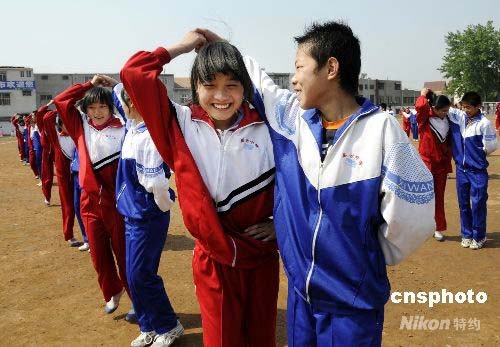 圖:山東棗莊中小學生跳起校園集體舞迎奧運(3)