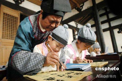 學生身穿漢服長衫聽課、老師手拿毛筆和戒尺、教室內懸掛著孔子畫像……中國古代私塾教學場景在浙江蘭溪的長樂村內再現,來自不同學校的不同年齡段的學生在新私塾中,學習的并非文化課程,這里不講課文、不教英文單詞、不上數學課,而是教國學和中國傳統禮儀等教育。據了解,利用業余時間來上私塾的學生有很多,而且都是學生自愿而來學習《四書五經》。 中新社發 宋健浩 攝