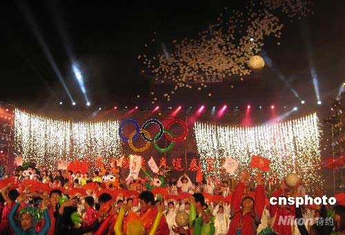 演員和觀眾振臂歡呼,臺上臺下焰火輝映,共同期待一百天后的北京奧運盛會。 中新社發 潘海濤 攝
