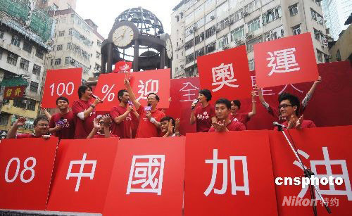 五月二日中午,香港特首曾蔭權出席時代廣場舉行的“全民迎圣火 中國加油”慶祝活動,與市民一起見證圣火在香港的傳遞。中新社發 蔡蔓莉 攝