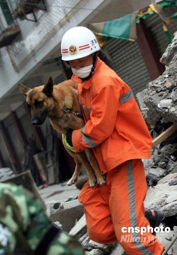組圖:消防搜救隊(duì)員抱搜救犬進(jìn)救災(zāi)現(xiàn)場(chǎng)(2)