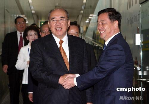 五月三十一日,中國國民黨主席吳伯雄一行結束大陸訪問行程,過境香港返臺。中新社發 武仲林 攝