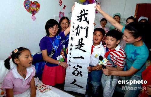 5月31日,來福州參加“海峽兩岸手拉手藝術節”的臺灣澎湖馬公小學音樂班的洪儀庭、許宜彙、林宏珍3位同學與福州小朋友,一起來到南京軍區福州總醫院愛心病房,與在這里接受治療的四川地震災區的小朋友共同舉行一場別開生面的聯歡活動,提前歡度“六一”兒童節。中新社發 劉可耕 攝