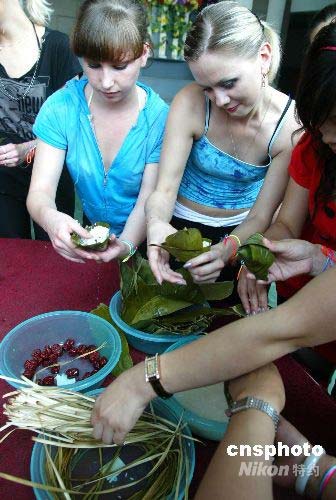 6月8日,在端午節來臨之際,北京世界公園組織中外賓客學包粽子,通過端午節的物質載體——粽子,認識中國傳統節日的文化內涵。中新社發 富田 攝