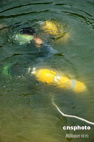 經過4名潛水員近2個小時的連續作業,終于將水庫最底下的2個放水口拉開。中新社發 李唐 攝