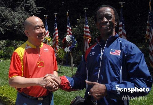 當地時間六月十日,三十七年前中美“乒乓外交”的兩位對手——原中國乒乓國手梁戈亮和美國乒乓球選手喬治·布雷斯威特在美國加州尼克松圖書館重逢。喬治說,當年他兩次輸給了梁戈亮,梁戈亮笑稱大家都贏了,贏得了友誼。尼克松圖書館將于十二日舉辦乒乓球友誼賽,重溫三十七年前中美“乒乓外交”的歷史性一幕,屆時代表中國老、中、青乒乓球國手的梁戈亮、喬云萍、張雷和宋時超將與美國乒乓球選手進行友誼賽。中新社發 張煒 攝