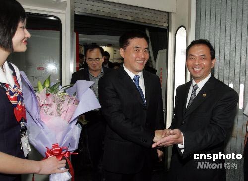 6月23日下午,臺北市長郝龍斌抵達上海浦東國際機場,開始對上海進行為期5天的訪問,這是新中國成立以來,臺北市長首次訪問上海。圖為上海市臺辦主任楊建榮(右)到機場迎接。中新社發(fā) 潘索菲 攝