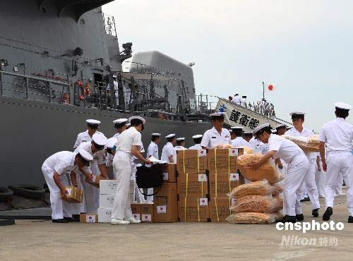 日本艦艇“漣”號訪華,隨艦搭載向四川災區提供的救援物資。中新社發 宋吉河 攝