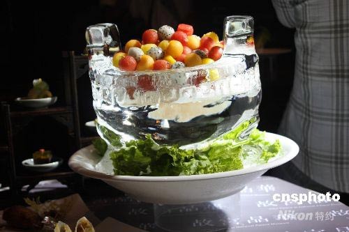 主廚仿照西周晚期的“毛公鼎”造型制作成冰雕,晶亮剔透的“鼎”中 ,盛裝著臺灣的特產(chǎn)水果,給人視覺與味覺的驚喜。中新社發(fā) 耿軍 攝