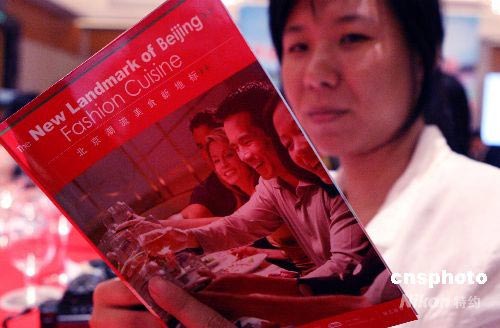 在頒獎典禮上中英文雙語《北京潮流美食新地標》一書舉行首發式,此書成為奧運期間國內外游客、運動員和記者們在京城的美食就餐指南。中新社發 錢興強 攝