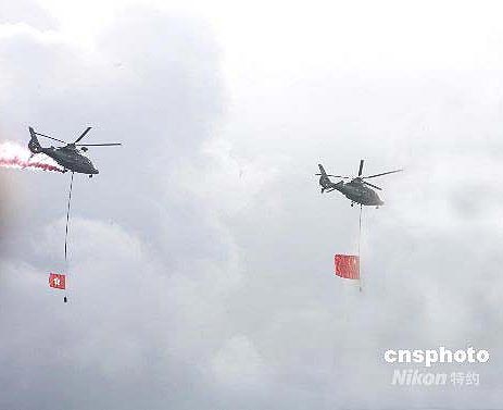 升旗儀式中,直升機懸掛國旗、區旗,噴射彩色煙火掠過金紫荊廣場上空。中新社發 王麗南 攝