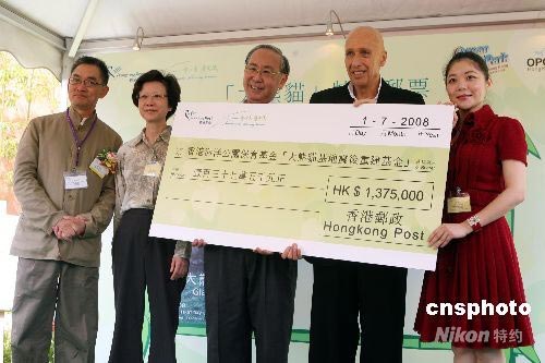 香港郵政將發(fā)售限量版大熊貓掌印及郵票珍藏紀(jì)念郵品籌得的一百三十多萬港幣轉(zhuǎn)贈(zèng)給香港海洋公園保育基金,以支持重建四川大熊貓基地設(shè)施。中新社發(fā) 武仲林 攝