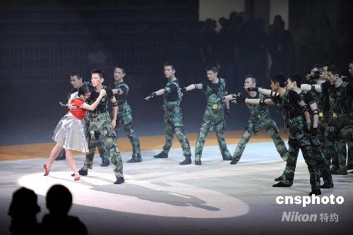 解放軍駐港部隊在慶香港回歸祖國11周年文藝匯演上演出抗震救災節目。中新社發 洪少葵 攝