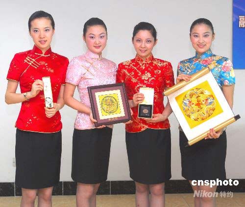 南京首航兩岸周末包機(jī)“神秘小禮物”揭曉,包括南京特有石頭雨花石所做成的擺設(shè)品、手鏈和鑰匙扣以及“工藝之寶”云錦。“身價(jià)不菲”的南京云錦卷軸掛畫可能會饋贈給頭等艙旅客。中新社發(fā) 王浩 攝