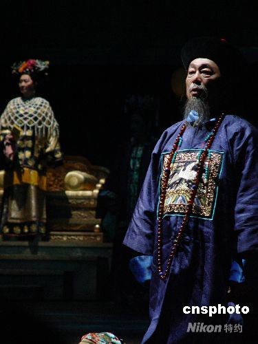 7月3日晚,香港話劇團帶來的經典話劇《德齡與慈禧》登陸北京國家大劇院。老牌影星曾江扮演的榮祿戲份雖然不多,卻絲絲入扣。中新社發 應妮 攝