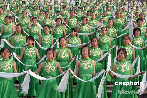 7月8日,奧運火炬在內蒙古呼和浩特市進行傳遞。在傳遞起點的民族團結寶鼎廣場,內蒙少女著盛裝迎接火炬。中新社發 廖攀 攝