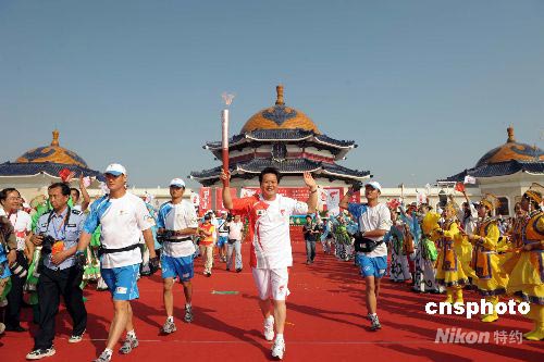 7月9日上午8時30分左右,隨著首棒火炬手、內蒙古獲得殘奧會金牌第一人哈斯勞高擎“祥云”火炬在成吉思汗陵前跑出第一棒,北京奧運火炬在鄂爾多斯的傳遞拉開了帷幕。 中新社發 廖攀 攝