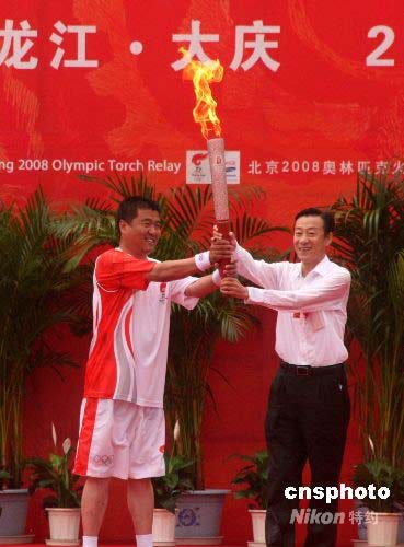 7月12日,北京奧運火炬在“石油之城”大慶傳遞,“鐵人鉆井隊”第19任隊長胡志強(左)從大慶市委書記韓學(xué)鍵手中接過第一棒火炬。 中新社發(fā) 周兆軍 攝