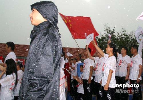 圖:大慶石油工人冒雨為奧運火炬?zhèn)鬟f吶喊助威