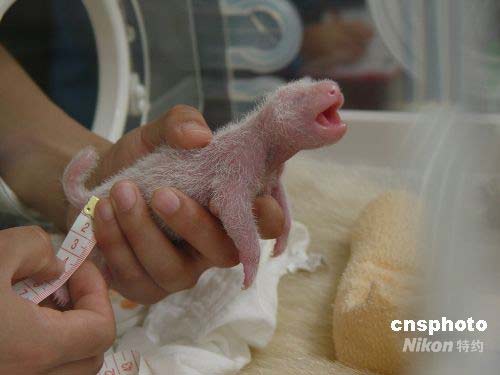 中國保護大熊貓研究中心雅安碧峰峽基地工作人員給熊貓幼仔量身長。中新社發 羅小韻 攝