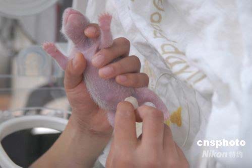 中國保護大熊貓研究中心雅安碧峰峽基地工作人員給熊貓幼仔人工排便。中新社發 羅小韻 攝