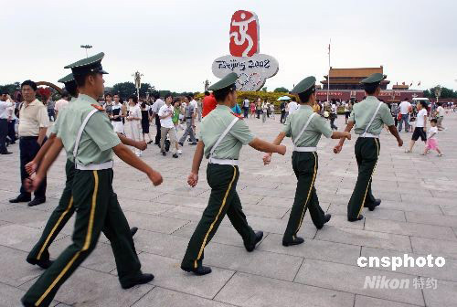 7月29日,一隊執勤武警士兵從天安門廣場“中國印·舞動的北京”主體花壇旁巡邏經過。天安門廣場“奧運”花壇整體工程進入尾聲,奧運氣氛更濃,市民與游客紛紛至此游玩拍照,安全保衛工作也加強,以確保“平安奧運”。 中新社發 劉新 攝