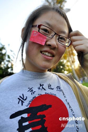 圖為剛到美國2年的高一女生自己制作了國旗貼紙和“北京歡迎你”字樣的T恤衫觀看北京奧運開幕式轉播。中新社發 陳鋼 攝