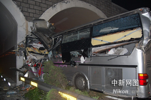 大客車右半邊竟然被撞的凹陷的只剩二分之一。作者:江耘