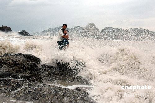 9月28日,受超強臺風“薔薇”影響,浙江溫州市洞頭島海域已是波濤洶涌,海礁上掀起的巨浪高達10多米。下午2時許,一對外地父女在海邊游玩時不慎被突漲的潮水困在礁石上,隨時可能被海浪吞噬。正在海邊巡邏的洞頭邊防大隊官兵發現險情后,迅速展開緊急營救,成功將父女從海浪中安全救上岸。中新社發 吳水斌 攝