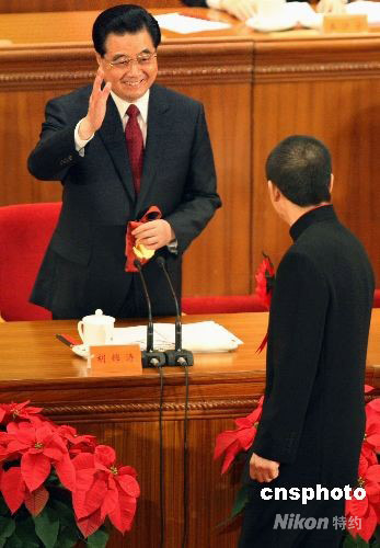 國家主席胡錦濤向獲獎單位和個人頒獎時,向獲獎的張藝謀表示祝賀。