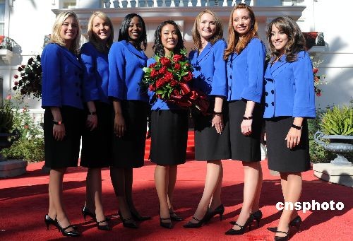十七歲的華裔高中生李君慧(中)十月二十一日當選二00九年度美國“玫瑰皇后”,她將引領二00九年元旦舉行的第一百二十屆帕薩迪納玫瑰花車大游行和九十五屆“玫瑰碗”杯美式足球總決賽。中新社發 張煒 攝