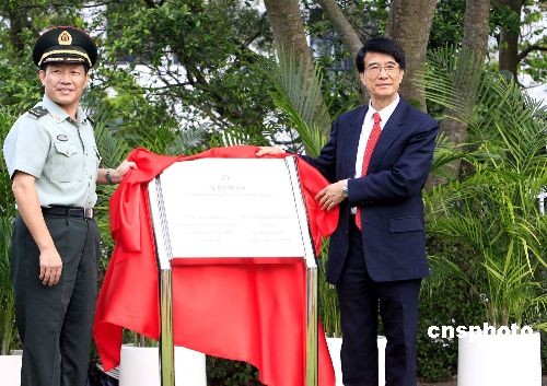 十月二十四日,中國人民解放軍駐港部隊八十位官兵訪問香港科技大學(xué)。圖為駐港部隊副司令董文久與香港科技大學(xué)校長朱經(jīng)武在科技大學(xué)草坪主持植樹紀(jì)念及牌匾揭幕儀式。中新社發(fā) 張勤 攝