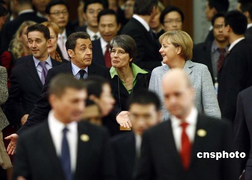 法國總統(tǒng)薩科奇與德國總理默克爾出席會議。中新社發(fā) 盛佳鵬 攝
