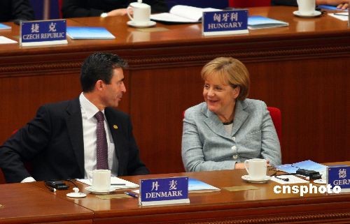 德國總理默克爾與丹麥?zhǔn)紫嗬鼓律陂_幕式上相談甚歡。中新社發(fā) 廖文靜 攝