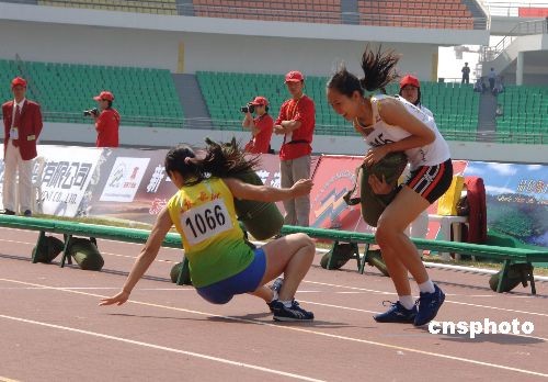 十月二十八日,女子30米搬重物賽跑中,重慶女選手朱躍(左)跑錯道并撞倒湖北女選手郭靜(右),所幸有驚無險,二人均完成賽程。中新社發 鄭祚聲 攝