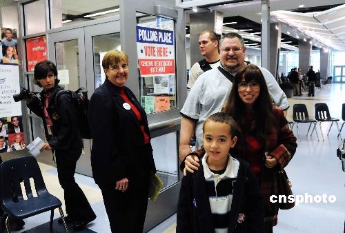 在臨近華盛頓的弗吉尼亞阿靈頓郡華盛頓·李高中投票站,愛德華夫婦和兒子亞當今天一大早來到投票站,愛德華告訴記者,他們的票投給了奧巴馬,只有他能夠帶領美國恢復美國在世界的領導地位。中新社發 邱江波 攝