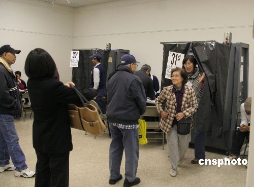 美國(guó)東部時(shí)間4日,美國(guó)總統(tǒng)選舉投票開(kāi)始.在紐約新華裔移民聚居地法拉盛地區(qū)投票點(diǎn),不僅有中文“在此投票”的說(shuō)明,更配有專(zhuān)職中文翻譯,可幫助講廣東話、福州話乃至上海話的居民順利投票。中新社發(fā) 魏晞 攝