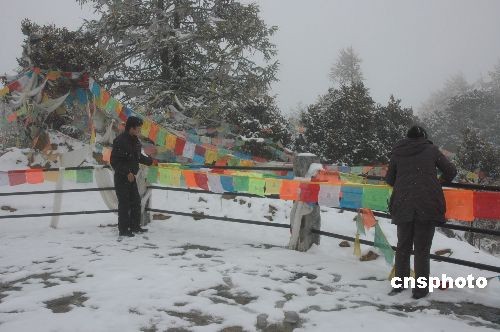 深秋季節(jié),四川甘孜藏族自治州高海拔地區(qū)普降大雪。圖為被譽為“中國最后的香格里拉”——四川稻城縣內(nèi),當(dāng)?shù)夭孛裾谘┑刂袙忑堖_(dá)祈禱吉祥。中新社發(fā) 肖龍聯(lián) 攝