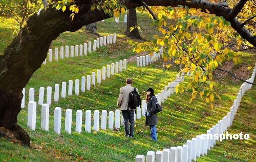 圖為一對市民在阿靈頓國家公墓憑吊埋葬在這里的親友。中新社發 邱江波 攝