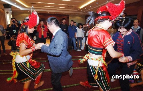 福建土樓采風團與高山族姑娘共跳竹桿舞