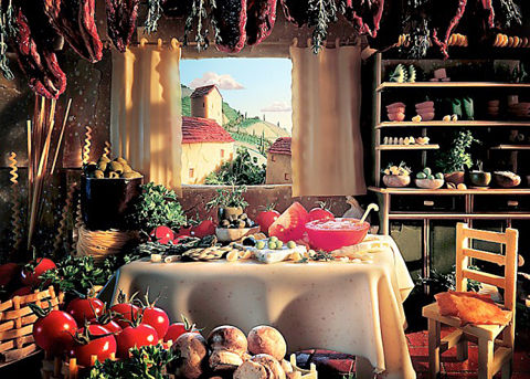 托斯卡納住宅充滿美味,有新鮮的意大利面窗簾和桌布、新鮮土豆制成的碗、新鮮巴爾馬干酪制成的墻。