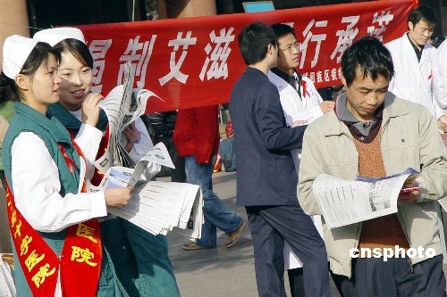 兩名醫(yī)護(hù)人員在鄭州火車站前向過往旅客發(fā)放防艾資料。