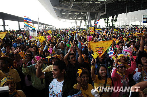 12月3日,泰國反政府的人民民主聯盟(民盟)支持者在曼谷素萬那普國際機場載歌載舞。 當天,民盟結束對總理府和曼谷兩座機場的占領,宣稱推翻頌猜政府的目的已經達到,所有反政府集會全部停止。